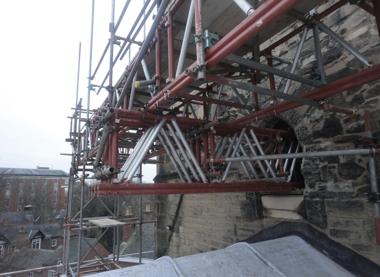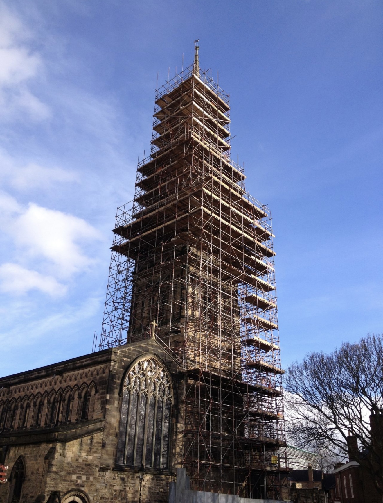 Working closely with PB Scaffold Design Ltd, Tamworth Scaffolding Co Ltd erected a fully boarded masons scaffold to allow the stonemasonry contractor to careful dismantle the spire, there was talk at the time that the spire may one day be rebuilt, but to this day it still remains only a tower.
